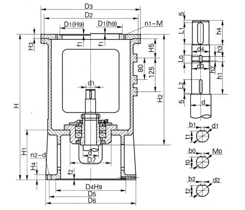 | 减速机输出轴径d0 | 减速机类别代号 | D1 | D2 | D3 | n1-M | f1 |