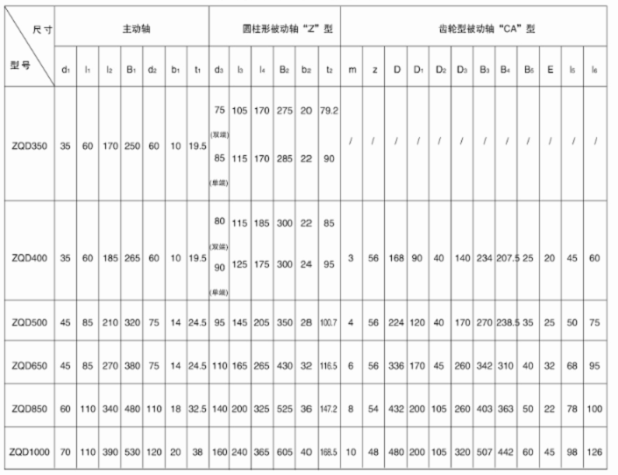 (1)结构型式 ZQD型减速机是在尽量不改变ZQ型减速机的输入输出轴的位置和安装尺寸的前提下,增加一级传动,它共有ZQD350+100、ZQD400+100、ZQD500+150、ZQD650+150、ZQD850+250和ZQDl000+250六种规格。