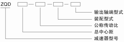 标记示:ZQD型减速机名义中心距1000cm,公称传动比为250(实际传动比为243.86)、第Ⅱ种装配形式为圆柱形,输出轴端为圆柱形,标记为:减速机ZQDl000-250-ⅡZ。