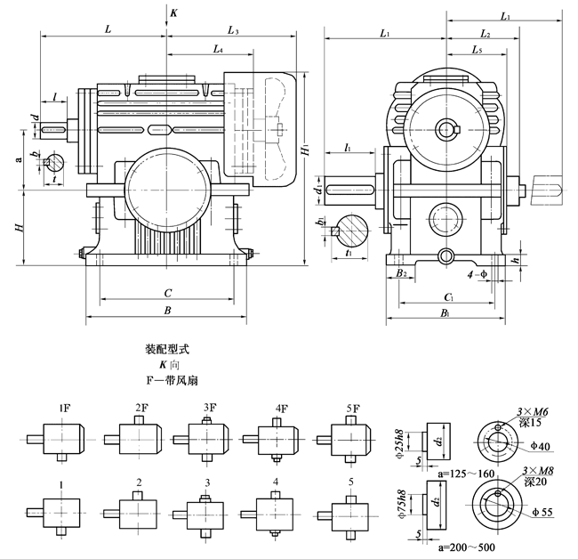 例 蜗杆在蜗轮之下, 中心距为200mm, 公称传动比为10, 第二种装配型式, 有风扇冷却的平面 包络环面蜗杆减速器: 减速器 TPU200 - 10 - 2F JB/T 9051—1999