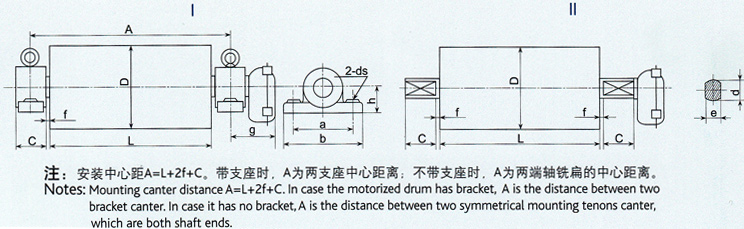 Notes: Mounting canter distance A=L+2f+C. In case the motorized drum has bracket, A is the distance between two bracket center. In case it has no bracket, A is the distance between two symmetrical mounting tenons center.